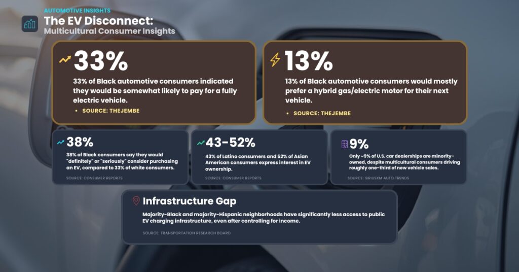 But beneath that narrative sits a quieter truth that most auto executives haven’t fully grappled with: the consumers who will ultimately determine the success of the EV transition, namely Black, Hispanic, and multicultural buyers, are interested, engaged, and paying attention, yet remain significantly underrepresented in actual EV purchases. That gap isn’t about desire. It’s about access, trust, and a market still designed around assumptions that no longer hold.